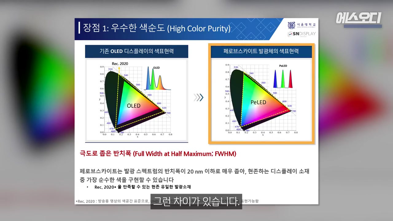 페로브스카이트 LED는 OLED(약 70%)나 QLED(약 75%)가 구현하지 못하는 높은 색 재현율을 자랑한다.